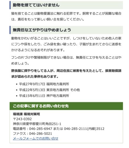 以前より主張しておりました愛川町のホームページの件です。ホームページ内の「猫の飼い方・マナー」の項目で、猫の餌やリに対して、町は損害賠償の存在を示して野良猫への餌やリに関する否定的(筆者にはそう感じられました)な見解を示しておりました。損…